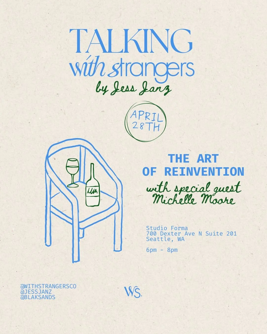 Join us at Studio Forma in Seattle on Tuesday, April 28th to meet new people, hear Michelle’s story, eat some snacks, and even peruse a bit of vintage goods.
