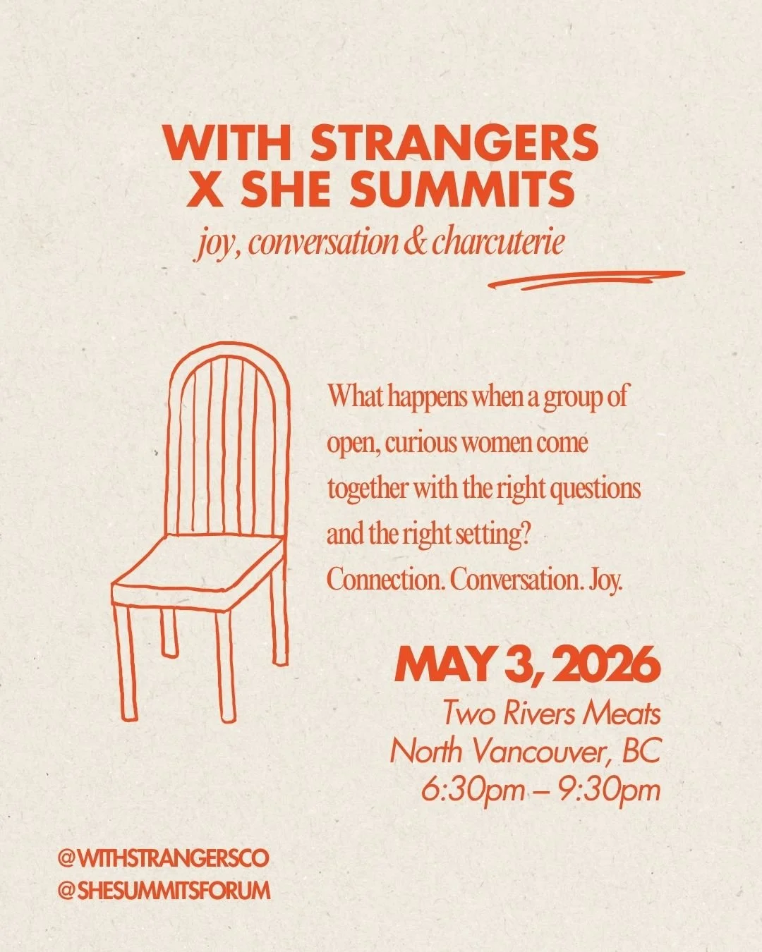 Jess is partnering with She Summits to bring this intimate experience to Vancouver at Two Rivers Meats. Move through small-group conversation rounds using With Strangers' signature prompts, hear a short discussion on joy and connection led by Jess, Danielle Leroux, and Laura van der Veer, and settle into the evening with a charcuterie spread featuring cheeses from Graydon's Cheese Cellar, Two Rivers Meats, and their famous tallow cookies.